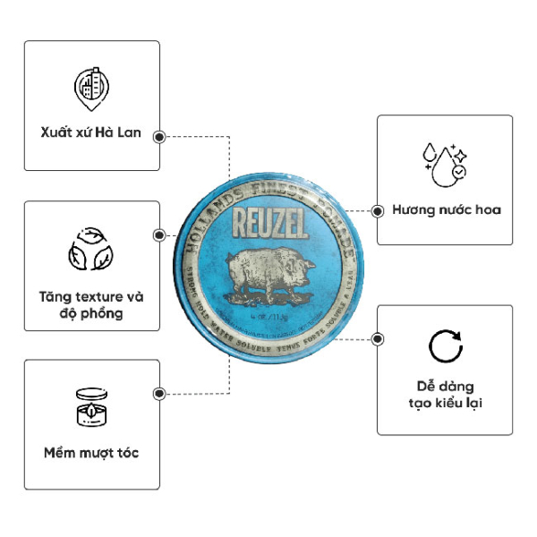 Pomade Reuzel Blue là sản phẩm pomade gốc nước nổi tiếng của nhà Reuzel – Thương hiệu chăm sóc tóc đến từ Hà Lan. Sản phẩm có chứa hàm lượng sáp ong lớn nên khi sử dụng, tóc sẽ có độ mềm rủ tự nhiên và đặc biệt là sản phẩm không gây cảm giác cứng.